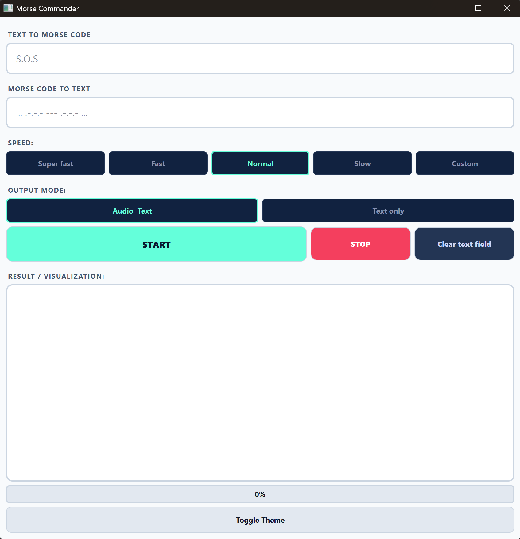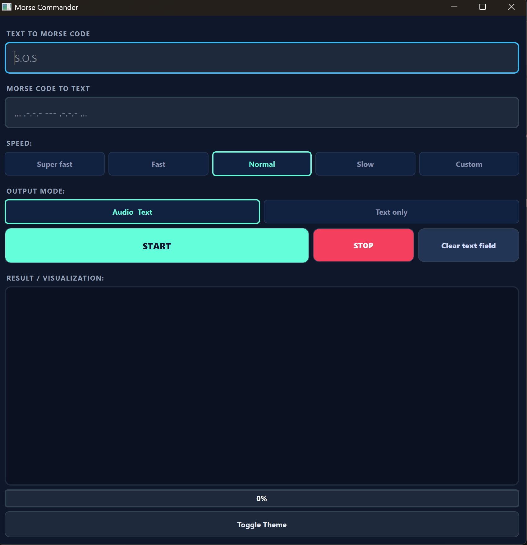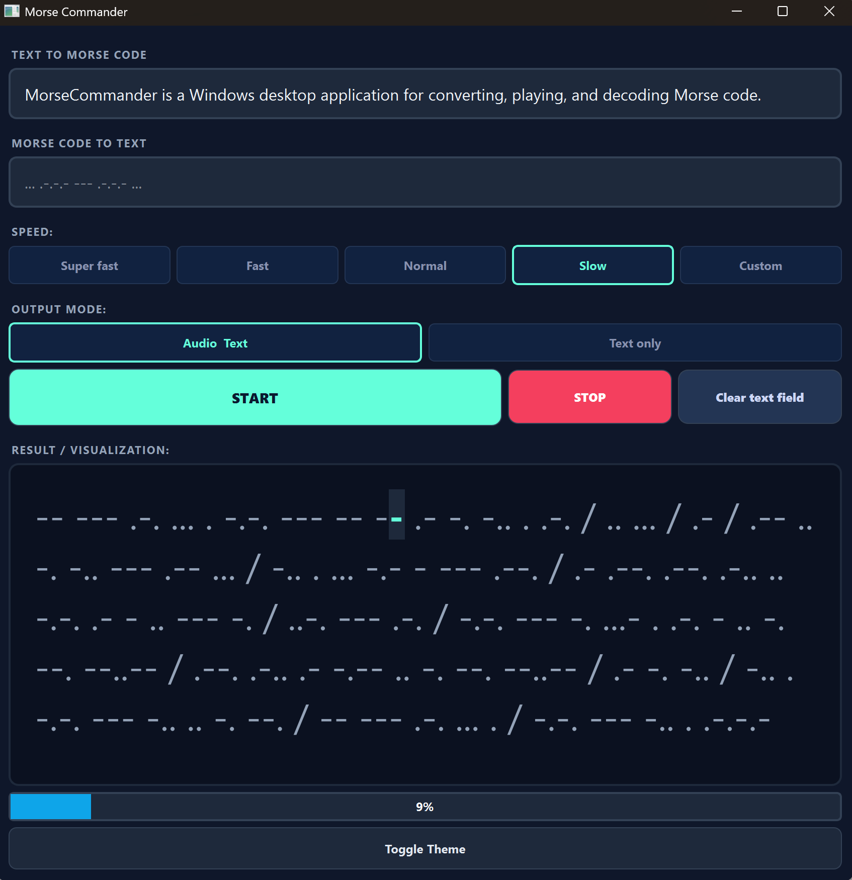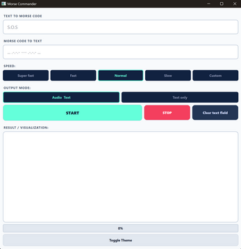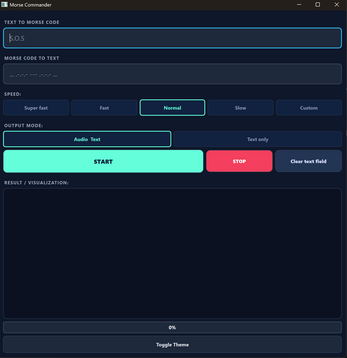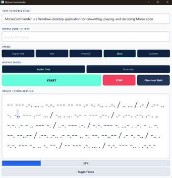 MorseCommander is a Windows desktop application for converting, playing, and decoding Morse code.